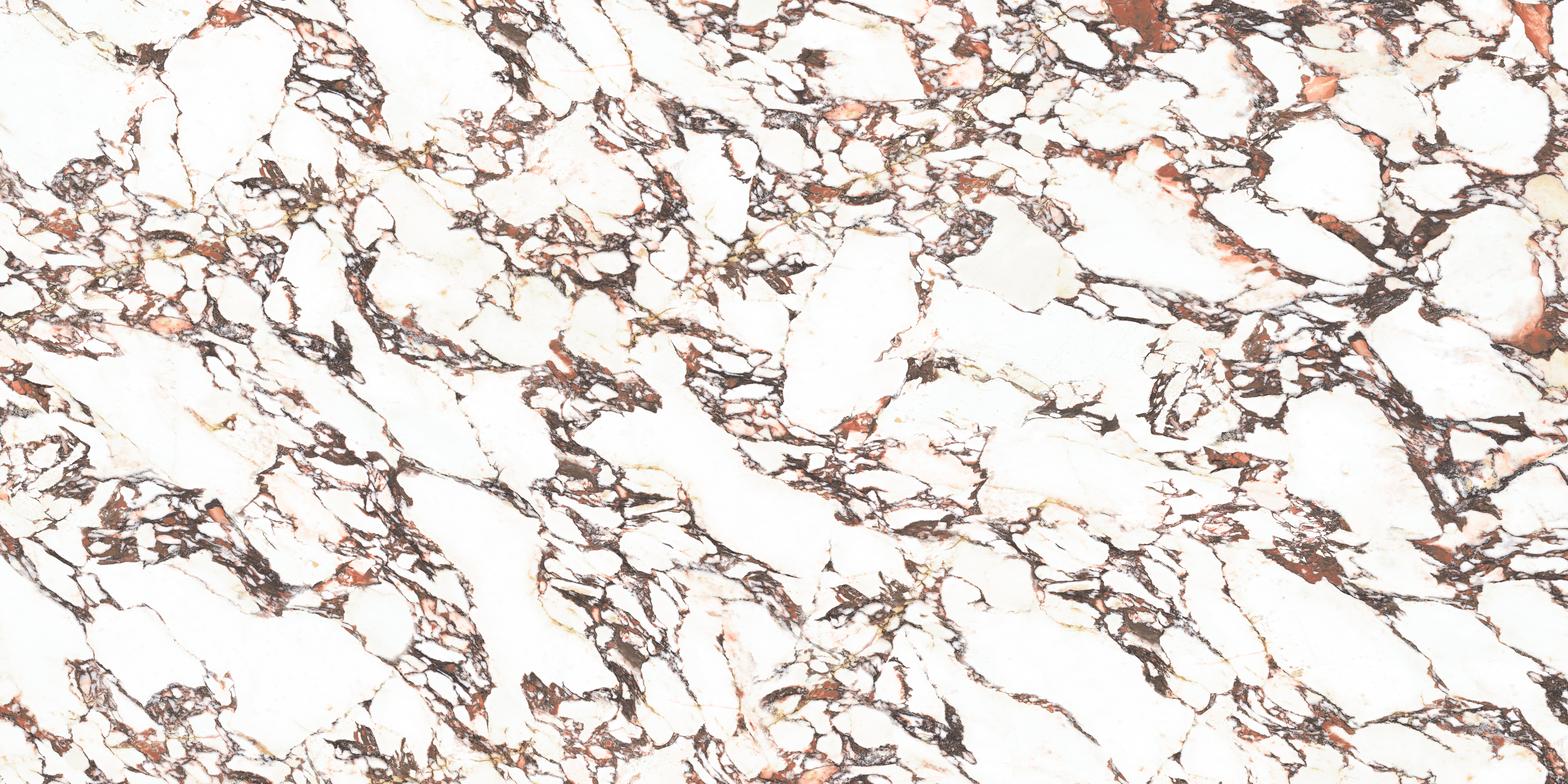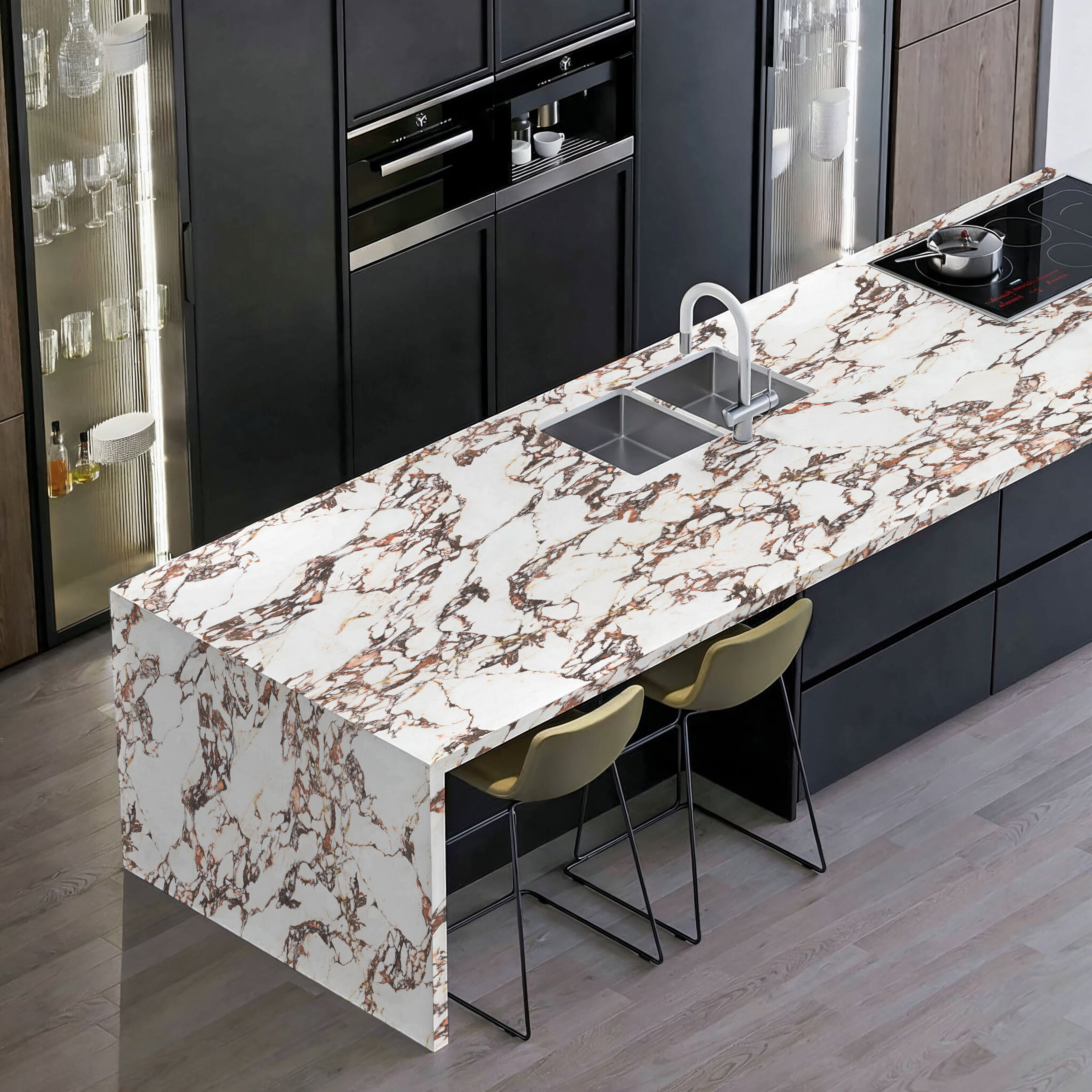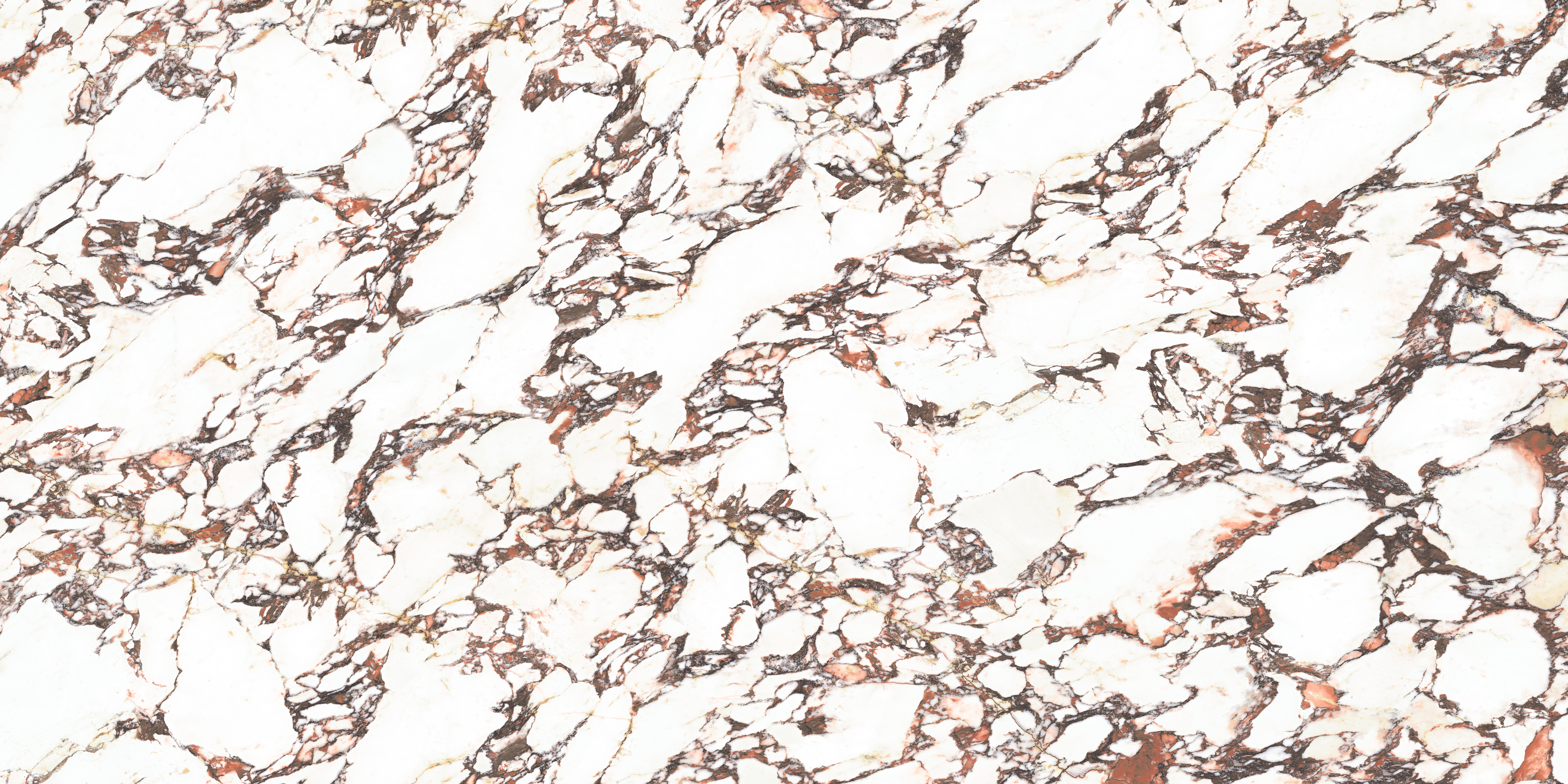 Calacatta Viola commands attention with dramatic burgundy and charcoal veining, boldly sweeping across a crisp white canvas in an expression of timeless Italian elegance.